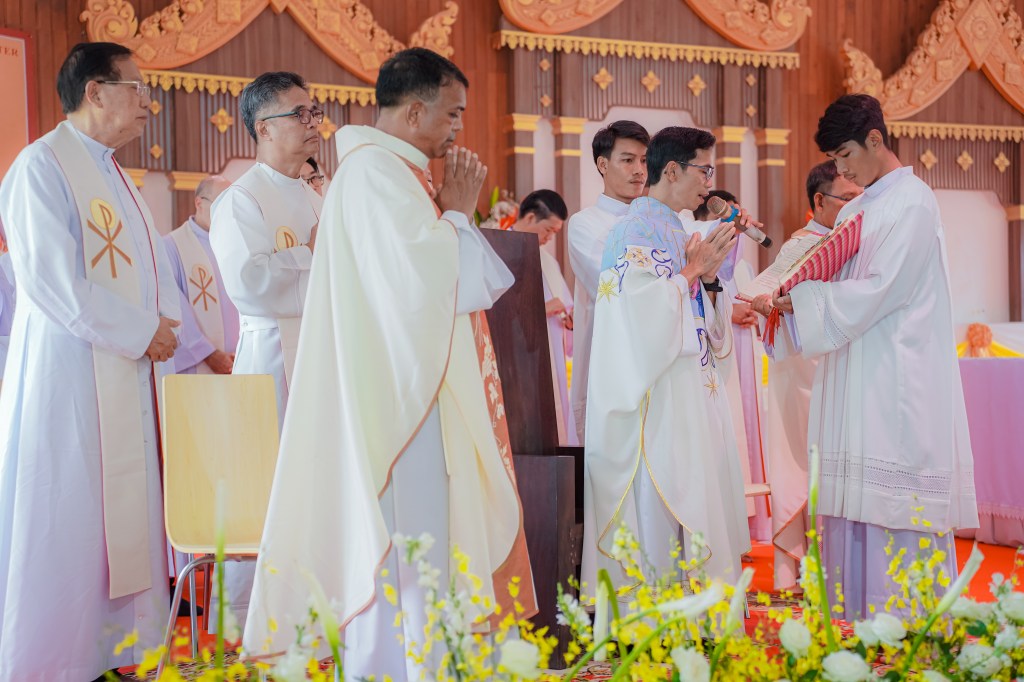 From the words of Fr. Roel Soto, SDB, emeritus superior of the Cambodia mission and director of Don Bosco Technical College of Poipet and the Salabalat Agro-Industrial School of Battambang, during the ordination of Fr. John Bosco Kong Somony, 31st May 2025, by Bishop Olivier Schmitthaeusler, first Mass the date after. In the photo, Fr. Eugene Xalxo, delegate superior of the Salesian Mission in Cambodia, with Fr. Somony. Behind Fr. Eugene is Fr Roel Soto, emeritus delegate superior and Fr. Theparat, Emeritus Provincial of THA Province.
